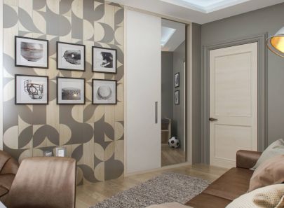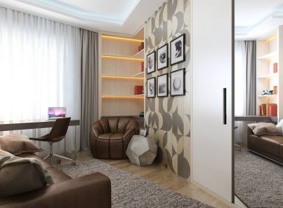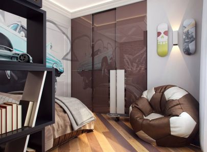 Вторая детская тоже рассчитана на мальчика. Для основы выбран серый цвет, на его фоне внимание фокусируется на белых стеллажах и входной двери, черных фоторамках и коричневой кожаной мебели. Стена над диваном украшена панно в теплых песочно-коричневых оттенках. Одна из стен помещения идет под углом, в нее встроен шкаф-купе, а сложный угол закрыт стеллажом с подсветкой.