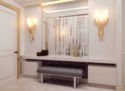 Зону с зеркалом в дизайне 5-и комнатной квартиры разместили в нише: с одной стороны ее ограничивает межкомнатная стена, с другой – короткая перегородка на ширину лакированной столешницы. Две боковые тумбы крепятся скрытыми подвесами, между ними видна облицовка задника – темно-коричневая глянцевая панель. В композицию отражающих поверхностей включаются хромированные ножки-петли скамьи.
