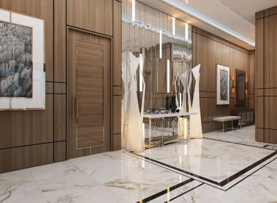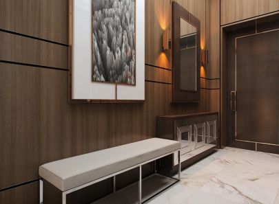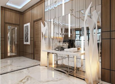 Акцентный элемент во входной зоне – огромное зеркальное панно, собранное из сотни вертикальных кусочков. Фрагменты расположены не сплошной поверхностью, а рельефно, слегка выступая над стеной. Отражения ломаются, рождая причудливые многомерные картины зазеркалья. В поддержку сложной, но интересной игре – парные напольные светильники, тоже с ломаным дизайном.
