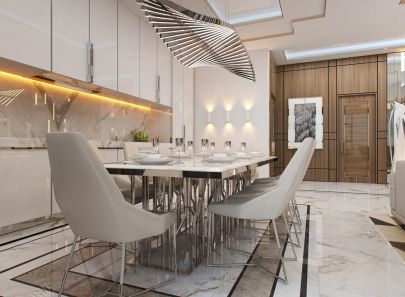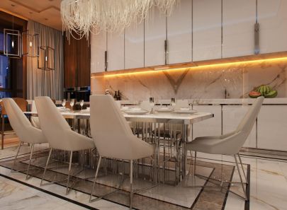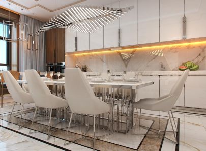 На кухне тонкие хромированные ножки обеденных стульев и подстолье, словно собранное из серебряных прутьев, красиво отражаются в мраморе. Теплую желтую подсветку сияющего фартука дополняют боковые бра на стене. Главную же роль играет светильник над обеденным столом: он напоминает световые ребра, сложенные в одну большую фантазийную волну.