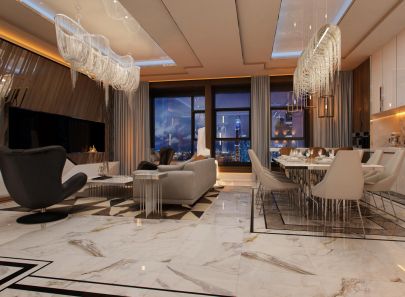 Планировка четырехкомнатной квартиры выполнена с объединенным пространством гостиной-кухни и тремя спальными комнатами. Задача дизайна – создать сверкающий интерьер, насыщенный блестящими поверхностями и отражениями. Вполне подходящий антураж для жизни современной семейной пары. Расскажем о средствах и приемах, которыми удается наполнить обстановку эффектом сияния.