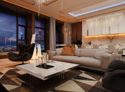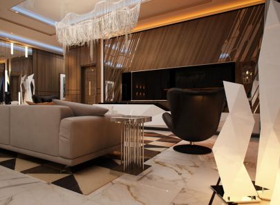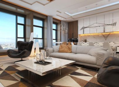 В сияющем интерьере гостиной геометрические абстракции соседствуют с прямыми линиями и строгими фигурами: