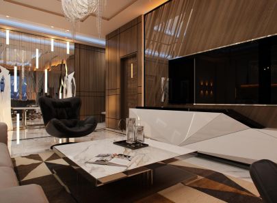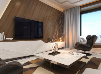 Современная квартира получила блестящий и сияющий дизайн, созданный тонко рассчитанным взаимодействием правильной и ломаной геометрии, матовых и глянцевых поверхностей, крупных зеркальных плоскостей и фрагментарных отражений.