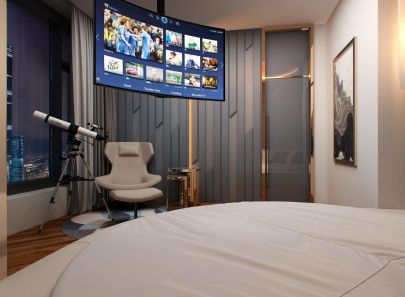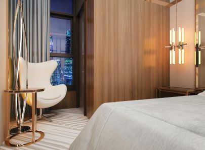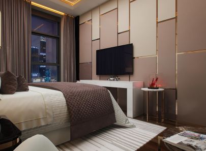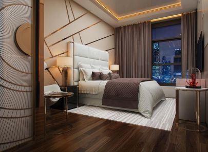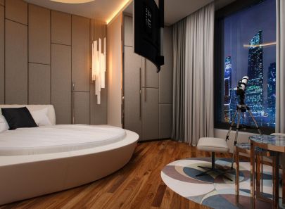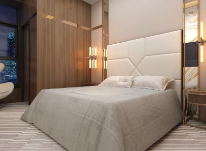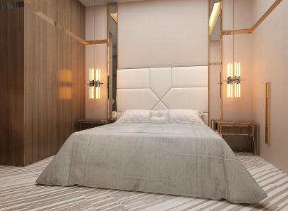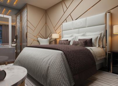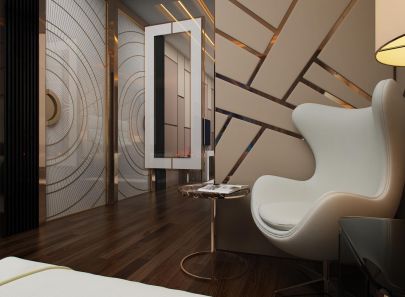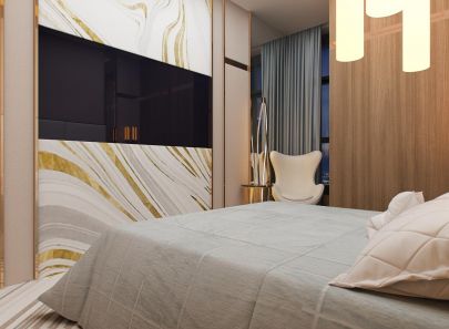 В интерьере второй спальни – больше блеска. Стены из кожаных панелей буквально расчерчены сияющими металлическими вставками. Фасады входной двери и платяного шкафа-купе украшены золотистыми полукружьями. Логично подключается к общей картине и золотая потолочная подсветка. Зеркальная облицовка стены рядом со шкафом умножает эффект роскоши.