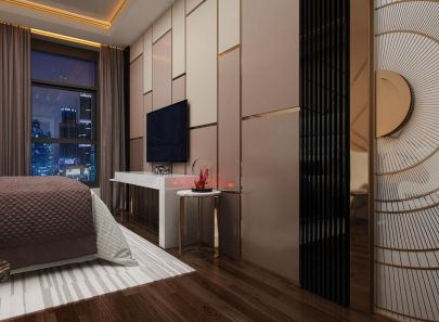 Оформление этой комнаты носит более сдержанный характер. Сверкающие металлические профили на светло-бежевых стенах смотрятся весьма органично в окружении деревянных панелей и мраморного серо-палевого полотна в ТВ-зоне. Узкие вертикальные вставки по бокам от изголовья кровати конструктивно перекликаются с подвесными светильниками из трубчатых элементов над тумбами.