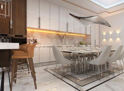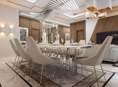 - комбинация контрастных прямоугольников на белом мраморном полу обозначает обеденную зону, ей вторит глянцевая потолочная ниша;
