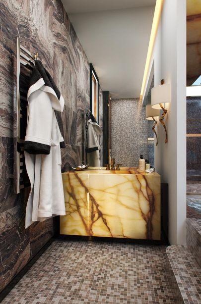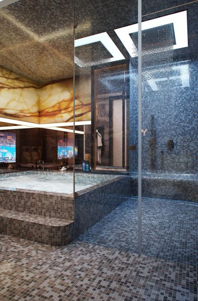 Просторная ванная оформлена серо-голубой мозаикой, в том числе на потолке. Прозрачные стенки душевой кабины свободно пропускают сияние от встроенных потолочных светильников. Мраморная тумба-раковина в желто-коричневых оттенках – центральная деталь умывальной зоны, а выполненная из этого же материала стеновая панель задает цветовую доминанту над квадратной купелью.