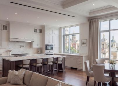 Наилучшее впечатление кухонный интерьер в стиле классики производит в просторных помещениях, с высоким потолком.