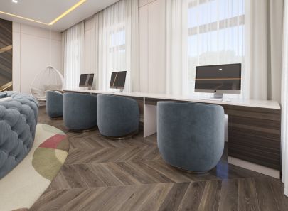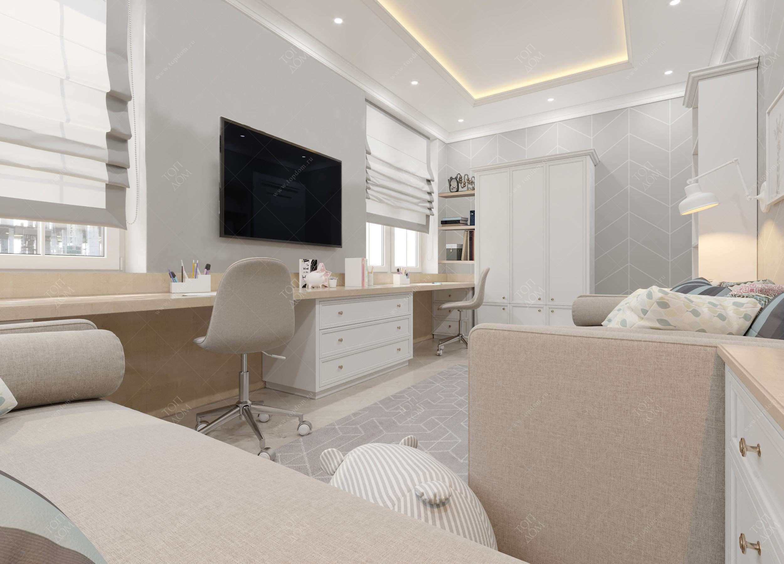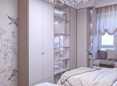 В современном варианте уместны насыщенные цветовые акценты, поверхность стен окрашивают или отделывают обоями светлых тонов. Потолок украшают подвесными конструкциями со встроенной подсветкой: в форме волн, облаков, цветочных бутонов. Напольным покрытием чаще всего служит практичный ламинат или ковролин. Мебель мобильна и легко трансформируется. Высокие гардеробные шкафы до потолка помогут сохранить пространство свободным.