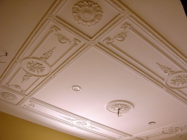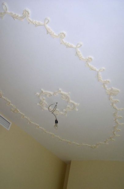 При подготовке поверхность очищают от старой штукатурки, плоскость выравнивают и грунтуют. Для каждой из деталей на потолок наносят разметку, чтобы при креплении не вылезли края и не оставались пустоты.