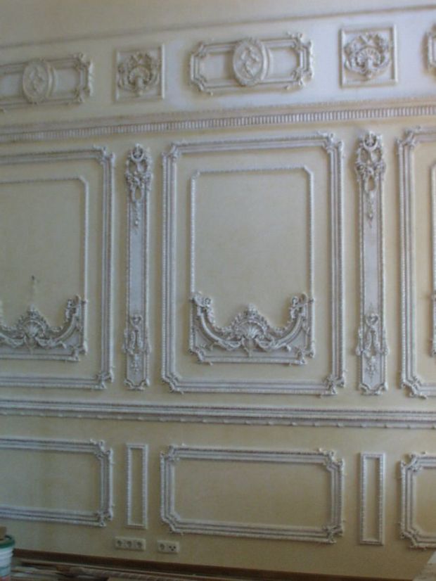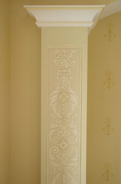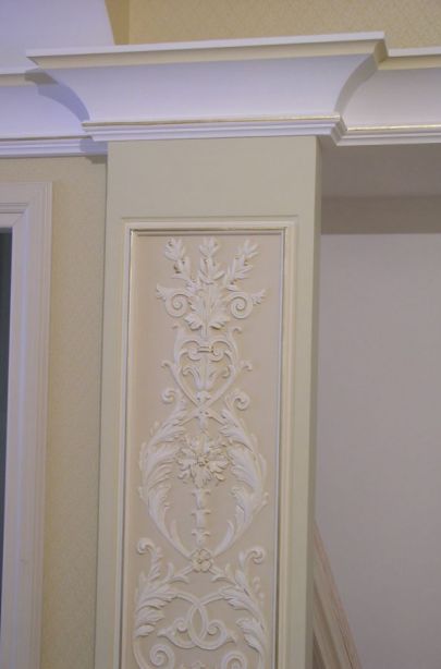 Для дизайна стен используют несколько видов лепного декора: молдинги (рельефные и простые), угловые сегменты и самостоятельные орнаменты, пилястры, кронштейны.