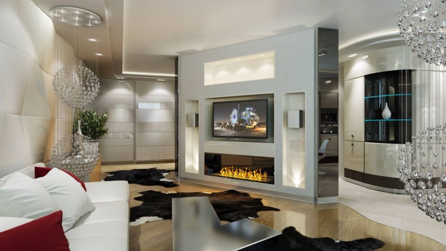 Традиционный материл для завершающей отделки стен в ванной комнате, санузле, прачечной, фартука на кухне. Хорошо переносит перепады температуры, создает цветовые и орнаментальные акценты. Для гостиных применяют крупноформатную плитку из мрамора, керамогранита, терракоты с незаметными швами – гладкая ровная поверхность расширяет внутреннее пространство помещения. Возможно точечное использование для акцента зоны камина или телевизора.