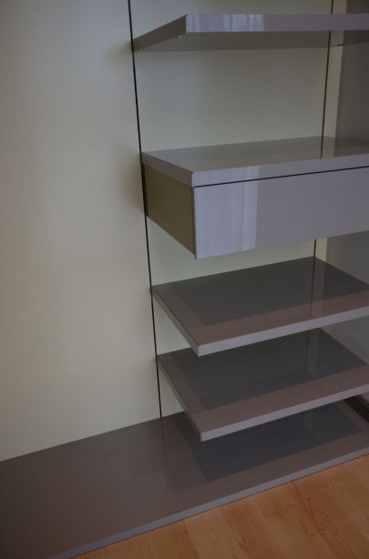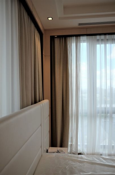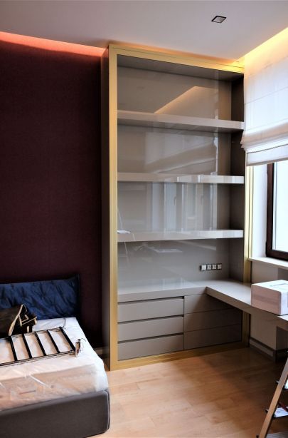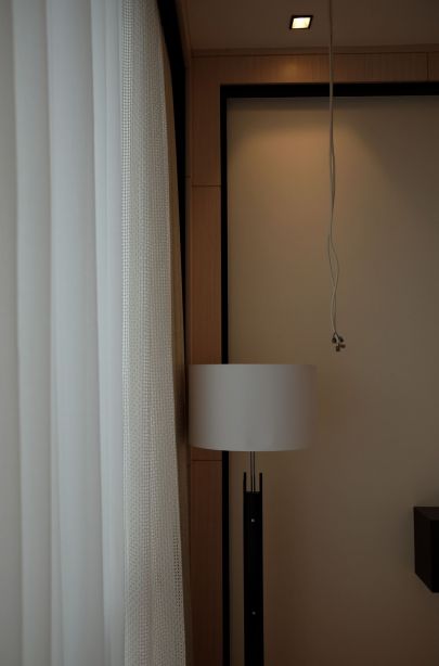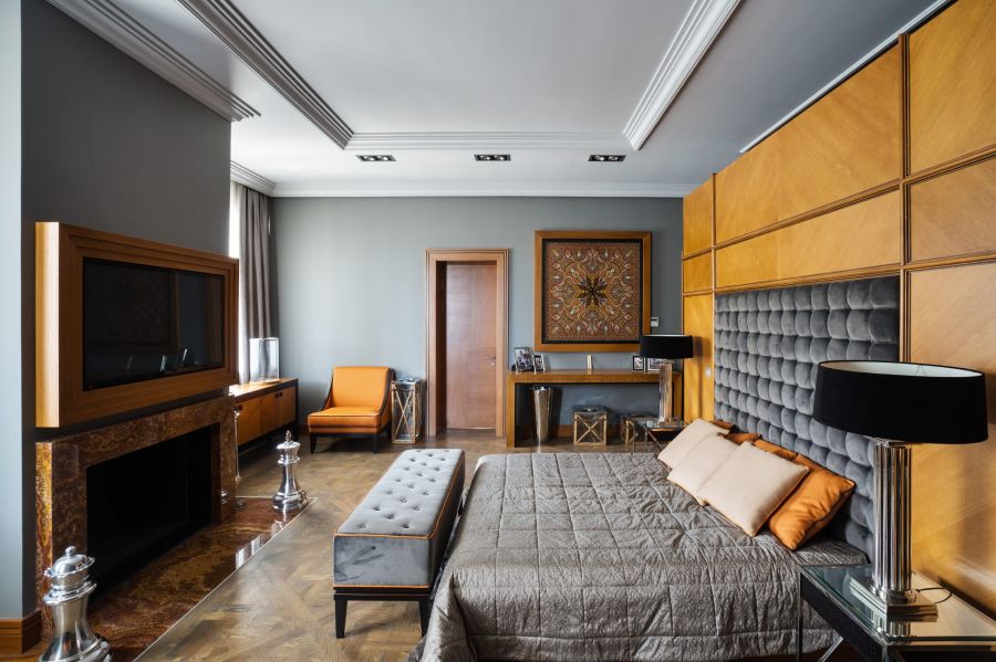 При реализации дизайн-проекта под ключ специалисты "ТопДом" успешно решили задачи эстетического и технического характера. В хозяйской и гостевой спальнях смонтированы стеновые панели в серой и бежевой текстильной обивке (кропотливых манипуляций потребовала врезка в тканевое полотно розеток и выключателей), установлены открытые и встроенные системы хранения, стены и оконные проемы декорированы деревянной золотисто-ореховой обшивкой.