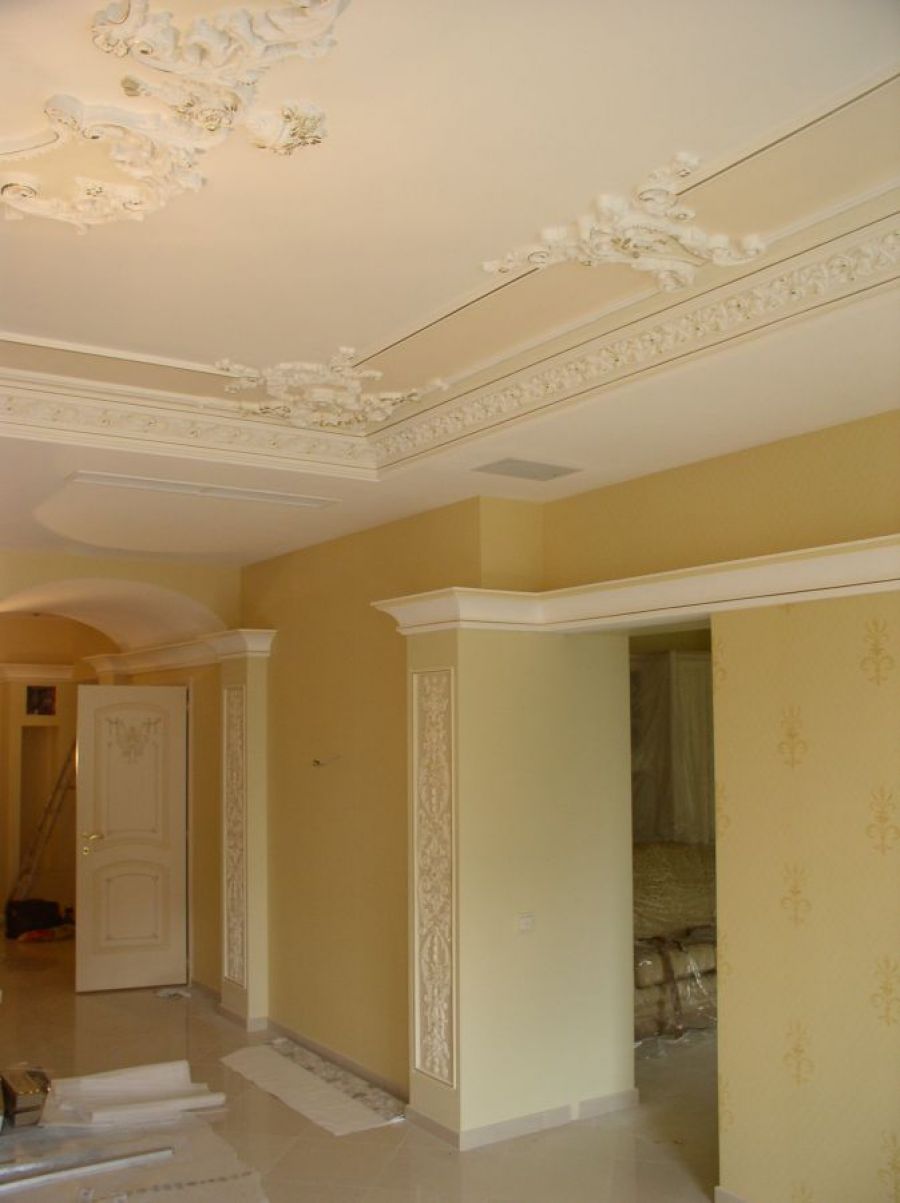 Пример дорогостоящего эксклюзивного ремонта – с использованием гипсового лепного декора, изготовленного на заказ. Филигранные классические узоры с позолотой украшают многослойные потолки, настенные пилястры, фризы, составляют симметричные композиции.