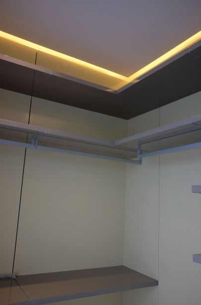 В широкие напольные плинтусы встроена подсветка, она выполняет декоративную функцию, основные источники света – симметрично расположенные потолочные споты.