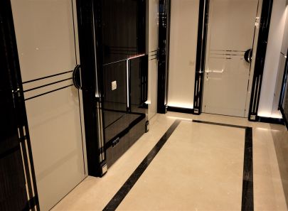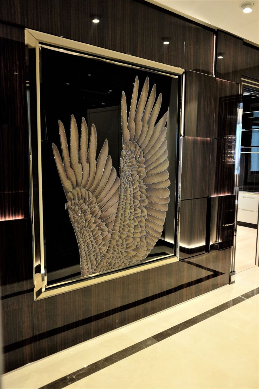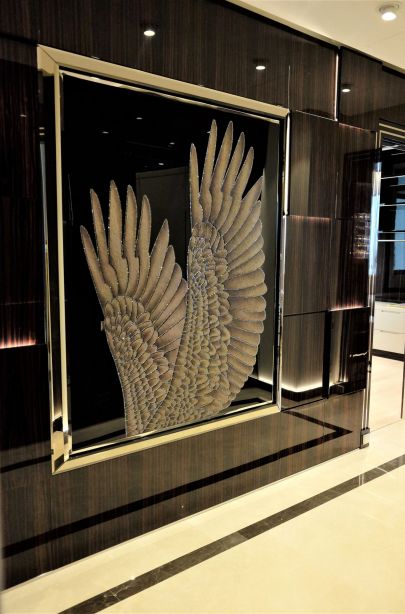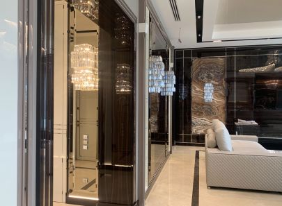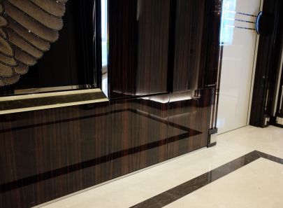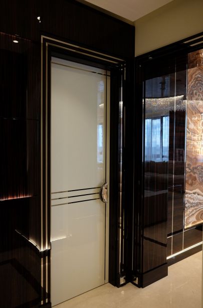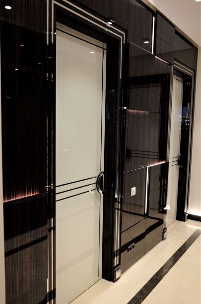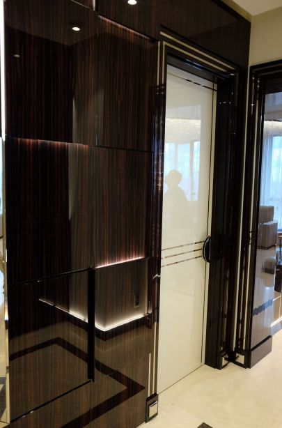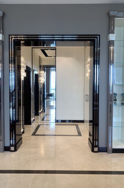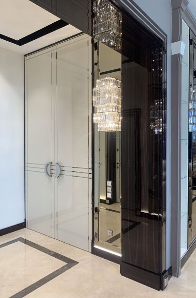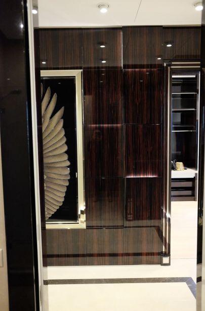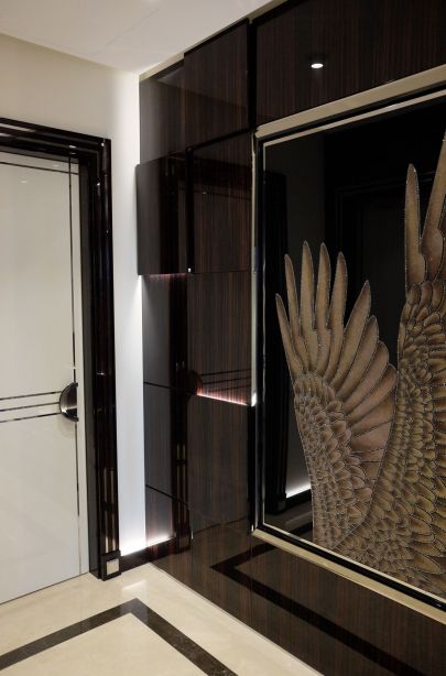 Контрастное цветовое решение реализовано отделочными материалами: пол облицован мрамором светлого кремового оттенка с черным кантом, стены обшиты полированными панелями из темно-коричневого зебрано, выходящие в холл дверные проемы обрамляют хромированные молдинги. За счет обилия отражающих поверхностей прихожая приобрела интересный и сложный визуальный ряд, переданный через детали. Центральным фокусом внимания стало настенное панно со стразами.