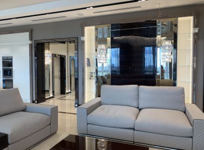 В процессе ремонтных работ стены гостиной обшили тонированными панелями зебрано. Медиа-зону выделяет композиция из парных мраморных слэбов богатой терракотовой палитры. В боковую стену встроен шкаф с витринами и зеркалами, его обрамляют изящные фигурные наличники с инкрустацией металлическими молдингами.