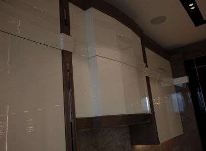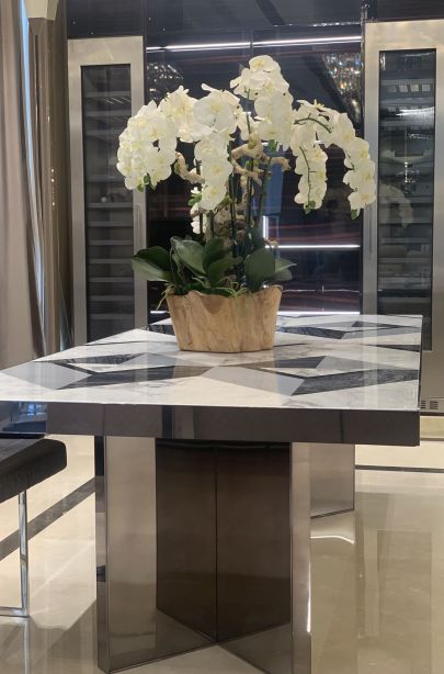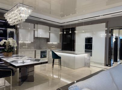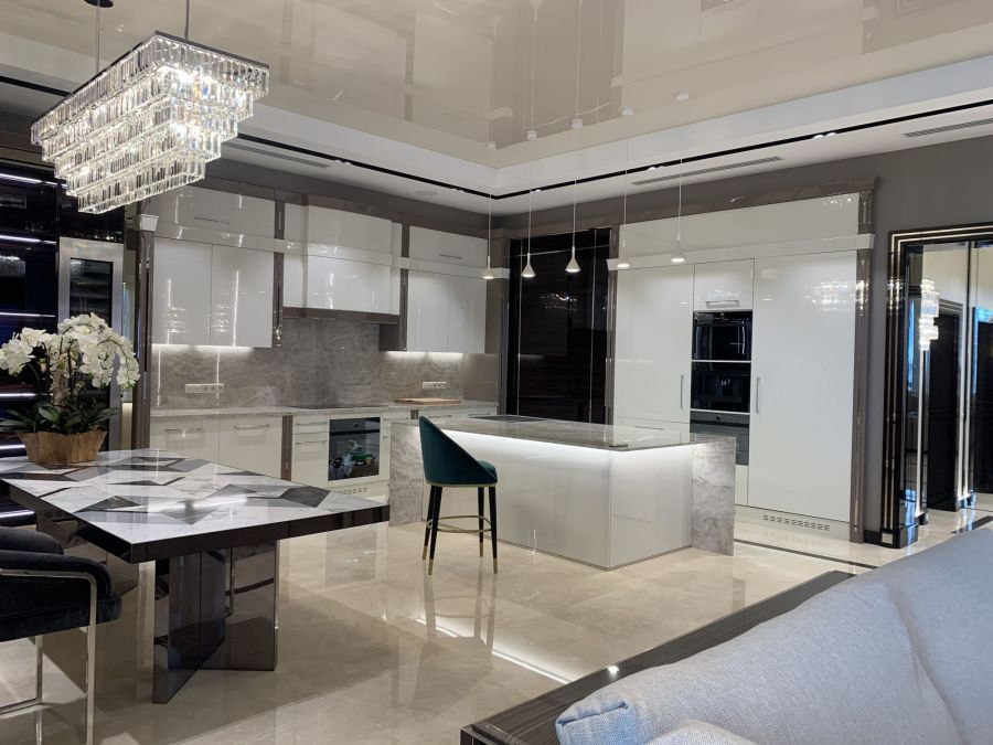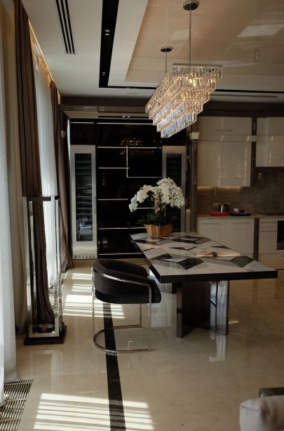 Дорогой дизайн квартиры и ремонт предусмотрел для кухонной зоны богатую мраморную отделку. Из натурального камня выполнен фартук, рабочие поверхности, столешница и боковая облицовка "острова". Серые оттенки гармонично соседствуют с белыми глянцевыми фасадами кухонной мебели и контрастными коричневыми настенными панелями. Столешницу обеденного стола украшает мраморная инкрустация с геометрическим рисунком.