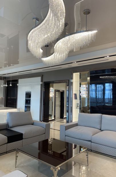 Зонировать большое открытое пространство помогает продуманная система освещения. Главные источники: над местом отдыха – комбинированная люстра с подвесками, над обеденным столом – многоярусный светильник. Мягкий рассеянный свет дают хрустальные бра в гостиной, в фоновом режиме работают встроенные по периметру полотка софиты.