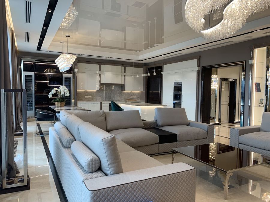 По планировке главная комната занимает просторное помещение, объединенное с кухней. Общность зон подчеркивает двухуровневый глянцевый потолок светлого бежевого оттенка, который красиво перекликается с серой диванной группой и мраморной облицовкой на кухне.