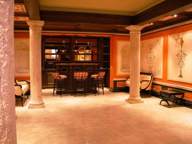 Ремонт коттеджа с элитной отделкой выполнен таким образом, что колонны присутствуют практически во всех помещениях. Четыре каменные колонны с грубой фактурой установлены в нижнем холле, они выполняют роль несущих конструкций и делят помещение на зону барной стойки, отдыха, входного проема.