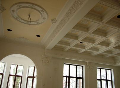 В эксклюзивной отделке особняка лепной декор – на первых ролях. Филигранная ручная работа мастеров "ТопДом" создала изысканные объемные узоры с мельчайшими деталями, сложные и витиеватые орнаменты на потолочных и стенных поверхностях. За счет множества элементом они выглядят пышно, многогранно.