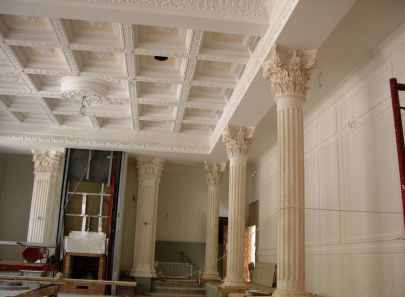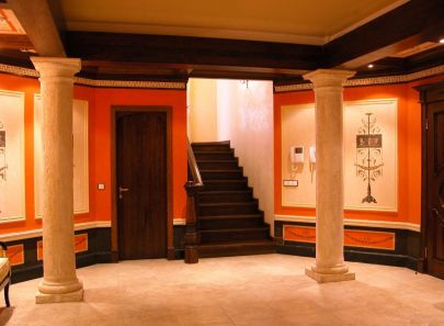 - В античных интерьерах колонны служили опорами для массивных высоких потолков, по периметру декорированных многослойной лепниной. Это требовало от конструкции надежности, поэтому для изготовления выбирали натуральный камень (мрамор, гранит).