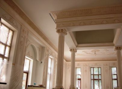 В элитном ремонте коттеджа под ключ команда "ТопДом" представила классические колонны в разнообразии великолепного декора: в холле установлены строгие опоры из известняка практически без украшений, во внутренних помещениях гипсовые капители декорированы многорядными лепными деталями.
