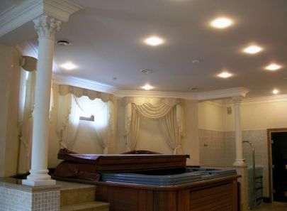 В SPA-центре на нижнем этаже декоративные изящные колонны, размещенные на перегородках-подставках, условно отделяют зону джакузи, мини-бассейна, место для релакса.