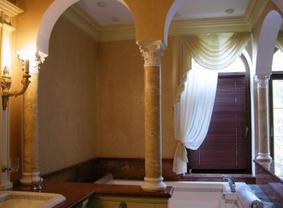 В дизайне ванной комнаты при проведении элитного ремонта в коттедже миниатюрные мраморные колонны дополнены арочными проемами. Подобный прием изящно зонирует помещение. Светло-бежевый мрамор стволов красиво перекликается с темно-коричневыми мраморными столешницами, а белые базы и капители – с глянцевой сантехникой.