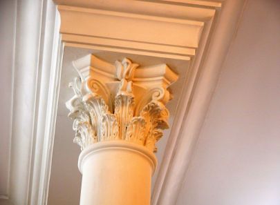 - Капитель – вершина ствола, самая выразительная в плане декоративных возможностей для эксклюзивного ремонта. Ее оформляют волютами (спиралевидные завитки с кружком в центре), пальметтой (растительный орнамент с веерообразными листьями), симметричными барельефами.
