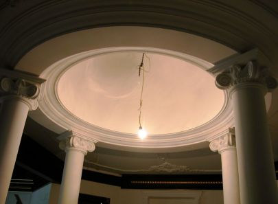 В парадных помещениях колоннады держат купольный свод в холле, арочный и кессонный потолки в гостиной. Использование колоннад позволяет сохранить эффект светлого, насыщенного воздухом пространства и в то же время отчетливо разграничить его.