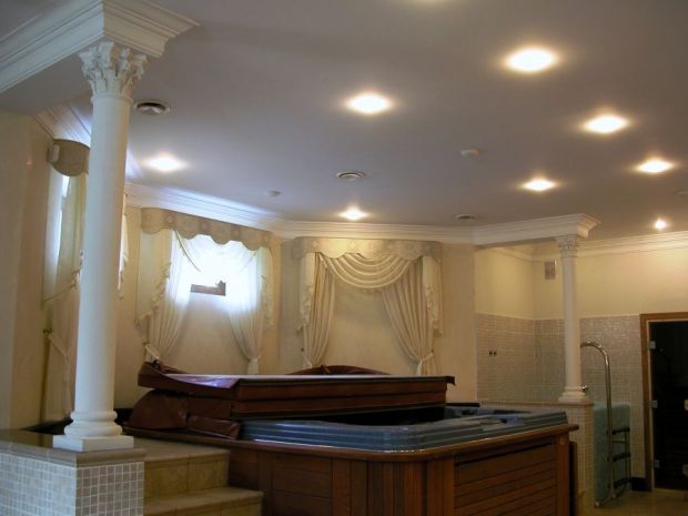 Классический стиль приветствует высокие потолки, украшенные гипсовой лепниной. Позолота придает декору дворцовый шик. Зрительно вытягивают помещение по вертикали декоративные колонны, расставленные симметрично. Потолок может быть выполнен гладким и окрашенным в светлый тон, зеркальным или задрапированным тканью.