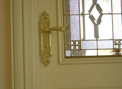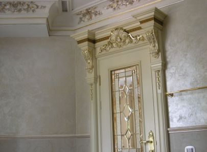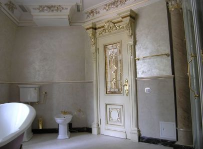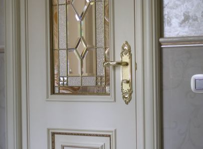 Деревянная дверь окрашена в мягкий оттенок слоновьей кости и обрамлена порталом с пышным декором капители. Она имеет парадный вид благодаря позолоте и витражной стеклянной вставке. Сантехника в ретро стилистике тоже дополнена сияющими латунными деталями.