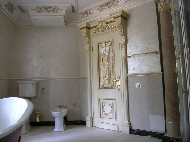 В случае ванной комнаты, где доминируют светлые оттенки, дизайн дверного проема обычно поддерживает цветом облицовку стен. Портал украшают пилястры, кронштейны, а вверху – богато декорированная капитель. Допускается матовое и зеркальное остекление, фацетированные вставки смотрятся как эффектная часть дизайна. Дверные ручки – важная часть антуража: устанавливаются бронзовые, золоченые, хромированные.