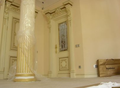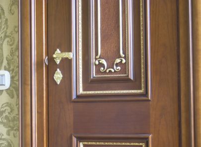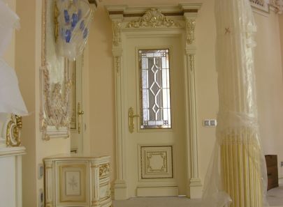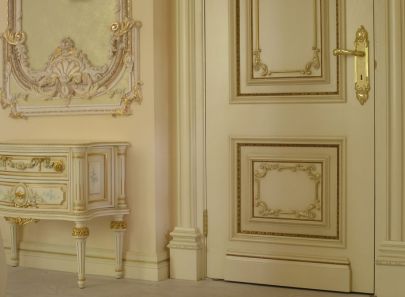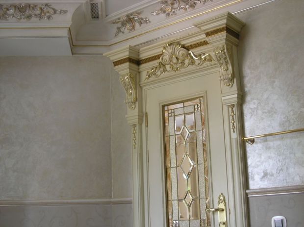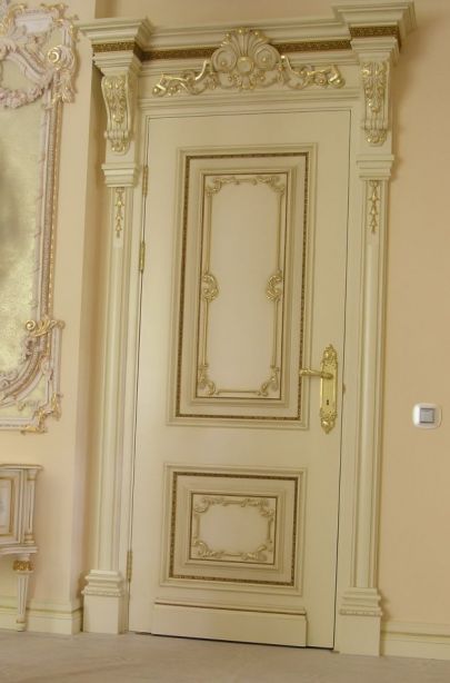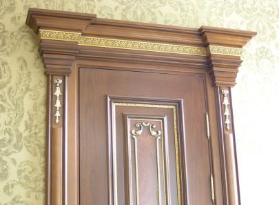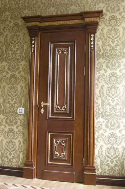 Классическая элитная отделка помещений большое внимание уделяет оформлению дверных порталов. Двери изготавливают из массива дерева, окрашивают или оставляют с подчеркнутым естественным фоном.