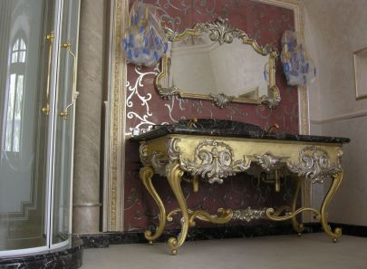 Столешницы из натурального камня своим цветом поддерживают гамму помещения или выделяются контрастным акцентом. Обязательный элемент элитной отделки – зеркало в золоченной или посеребренной раме.
