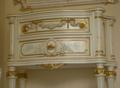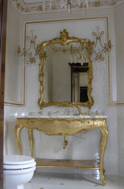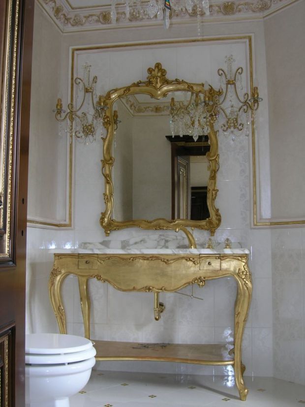 В туалетной комнате золотая консоль с умывальником увенчана белой мраморной столешницей. Зона зеркала в золотом обрамлении украшена бра с хрусталем.