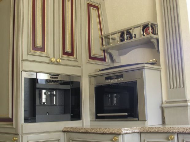В элитной отделке загородного дома на кухне установлен гарнитур из дерева, окрашенного в светло-серый цвет, выделенный контрастными бордовыми вставками с позолотой. Столешницы в зонах готовки выполнены из бежевого гранита, фартук оформлен как естественное продолжение рабочей поверхности.