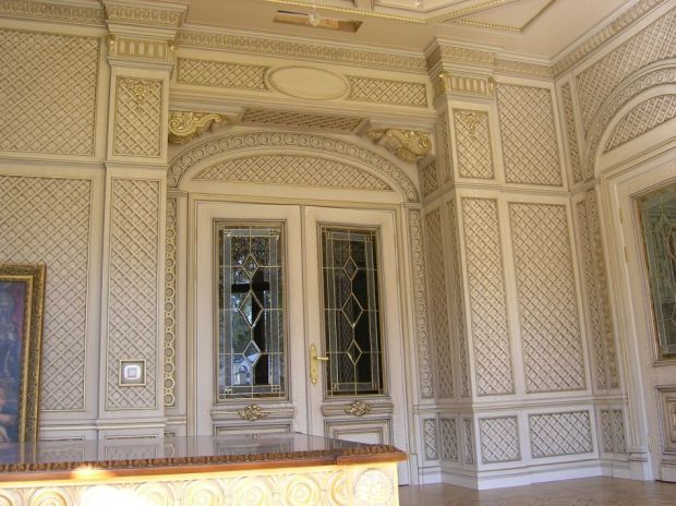 В реализованном проекте "ТопДом" по обустройству загородного дома особое внимание привлекает гостиная, оформленная в светлых бежевых оттенках. Здесь выполнена эксклюзивная отделка стен комнаты деревянными панелями с тонким переплетом, дверные проемы и части стен украшены декоративными арками в виде резных колец. Тонкие позолоченные молдинги по периметру панелей и потолочные фризы подчеркивают парадность интерьера.
