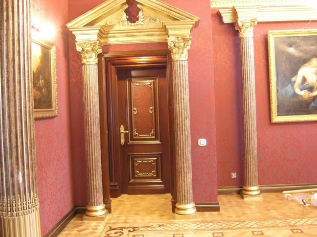 - Комбинирование разнофактурных материалов. Распространенные варианты – сочетание деревянных панелей (буазери) и обоев, штукатурки, покраски; придание рельефа с помощью изящных молдингов и бордюров, симметрично расположенных пилястр.