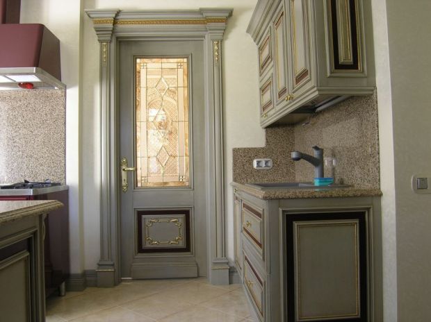 - Кухонный гарнитур в классике изготавливают из натурального дерева и декорируют резьбой, филенками, молдингами. Для помещения со светлыми стенами или при недостатке площади рекомендуется выбирать шкафы бежевого, белого, светло-серого, кремового оттенка. Эксклюзивная отделка дома с просторной кухней может включать мебель более темных цветов.