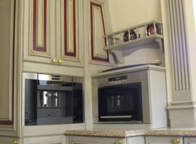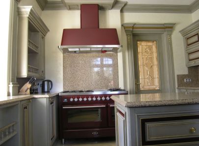 В элитной отделке загородного дома на кухне установлен гарнитур из дерева, окрашенного в светло-серый цвет, выделенный контрастными бордовыми вставками с позолотой. Столешницы в зонах готовки выполнены из бежевого гранита, фартук оформлен как естественное продолжение рабочей поверхности.