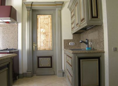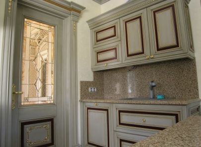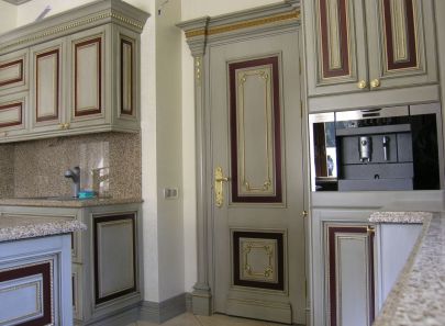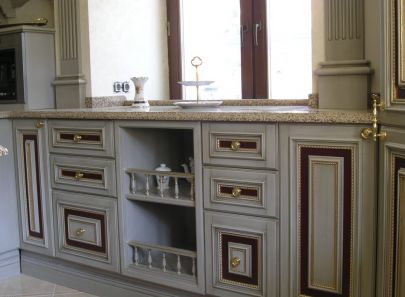 - Кухонный гарнитур в классике изготавливают из натурального дерева и декорируют резьбой, филенками, молдингами. Для помещения со светлыми стенами или при недостатке площади рекомендуется выбирать шкафы бежевого, белого, светло-серого, кремового оттенка. Эксклюзивная отделка дома с просторной кухней может включать мебель более темных цветов.
