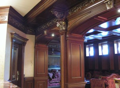 В реализованном проекте "ТопДом" по обустройству загородного дома особое внимание привлекает гостиная, оформленная в светлых бежевых оттенках. Здесь выполнена эксклюзивная отделка стен комнаты деревянными панелями с тонким переплетом, дверные проемы и части стен украшены декоративными арками в виде резных колец. Тонкие позолоченные молдинги по периметру панелей и потолочные фризы подчеркивают парадность интерьера.