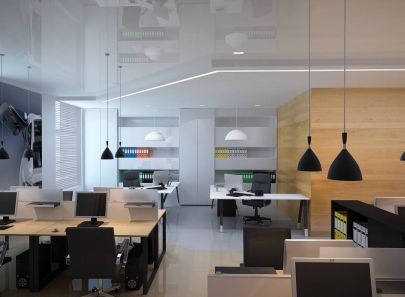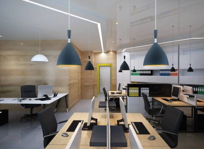 За освещение в кабинете офиса отвечают скрытая потолочная подсветка и подвесные лампы над каждым рабочим местом. Оконные жалюзи рассеивают дневной свет.