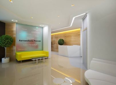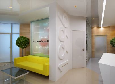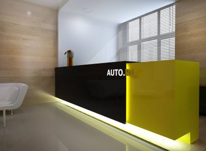 Компания занимается всероссийским автомобильным порталом, об этом напоминает инсталляция с названиями городов в приемной, а также небольшая перегородка с объемными цифрами – датой создания компании. С обратной стороны инсталляции обустроен отдельный рабочий кабинет, от коридора его отгораживает прозрачная панорамная перегородка.