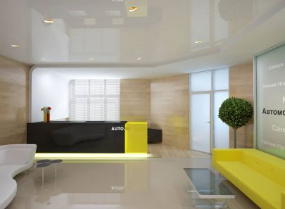 В натяжной глянцевый потолок приемной вмонтированы точечные светильники, зону стойки и желтого дивана логически объединяет подвесная потолочная конструкция с круглыми светодиодными источниками. Желтыми светодиодами акцентирован и логотип компании, который предлагается разместить или на межкомнатной перегородке, или на стойке.