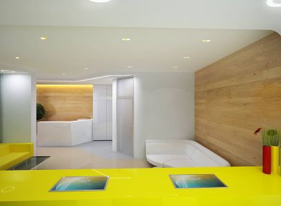 Энергичный желтый цвет переходит в зону ожидания: ярко-желтый диван с прямыми строгими линиями соперничает здесь с плавными изгибами дивана с белой обивкой.