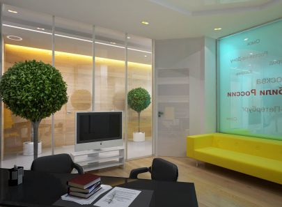 Яркие желтые акценты в мебели, оформлении стен, стойки ресепшен привлекают внимание и задают интерьеру офиса мажорное настроение. Вместе с тем не мешают рабочей атмосфере, благодаря грамотно подобранному фону: бежевым, белым, песочным оттенкам.